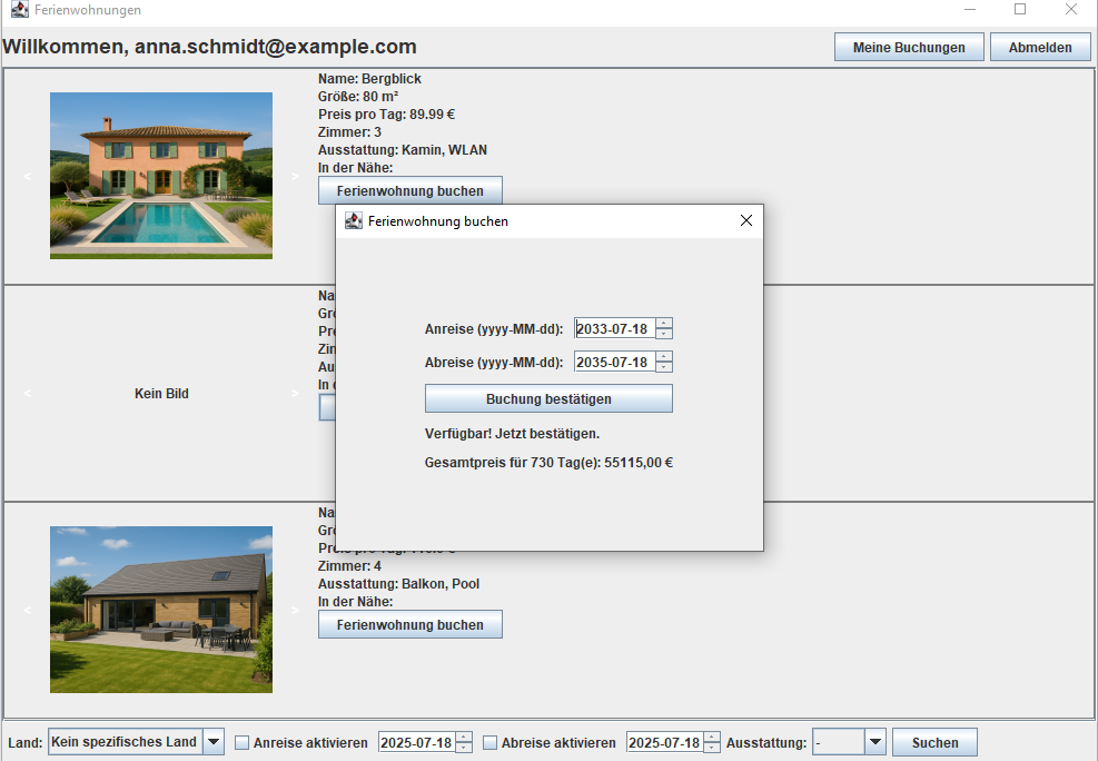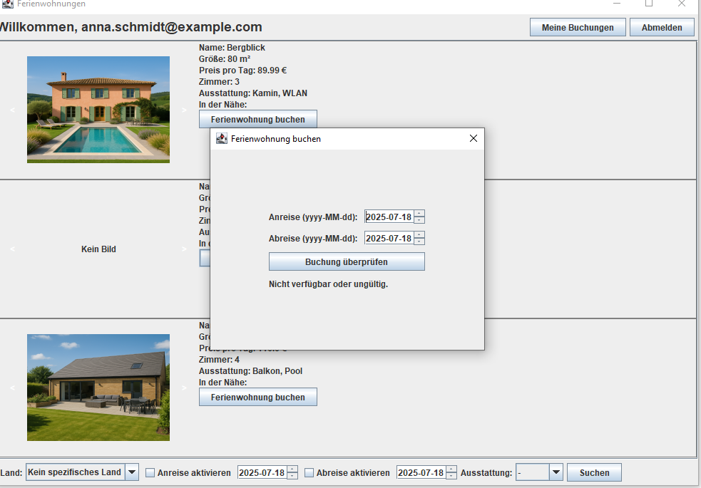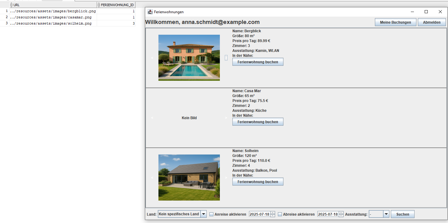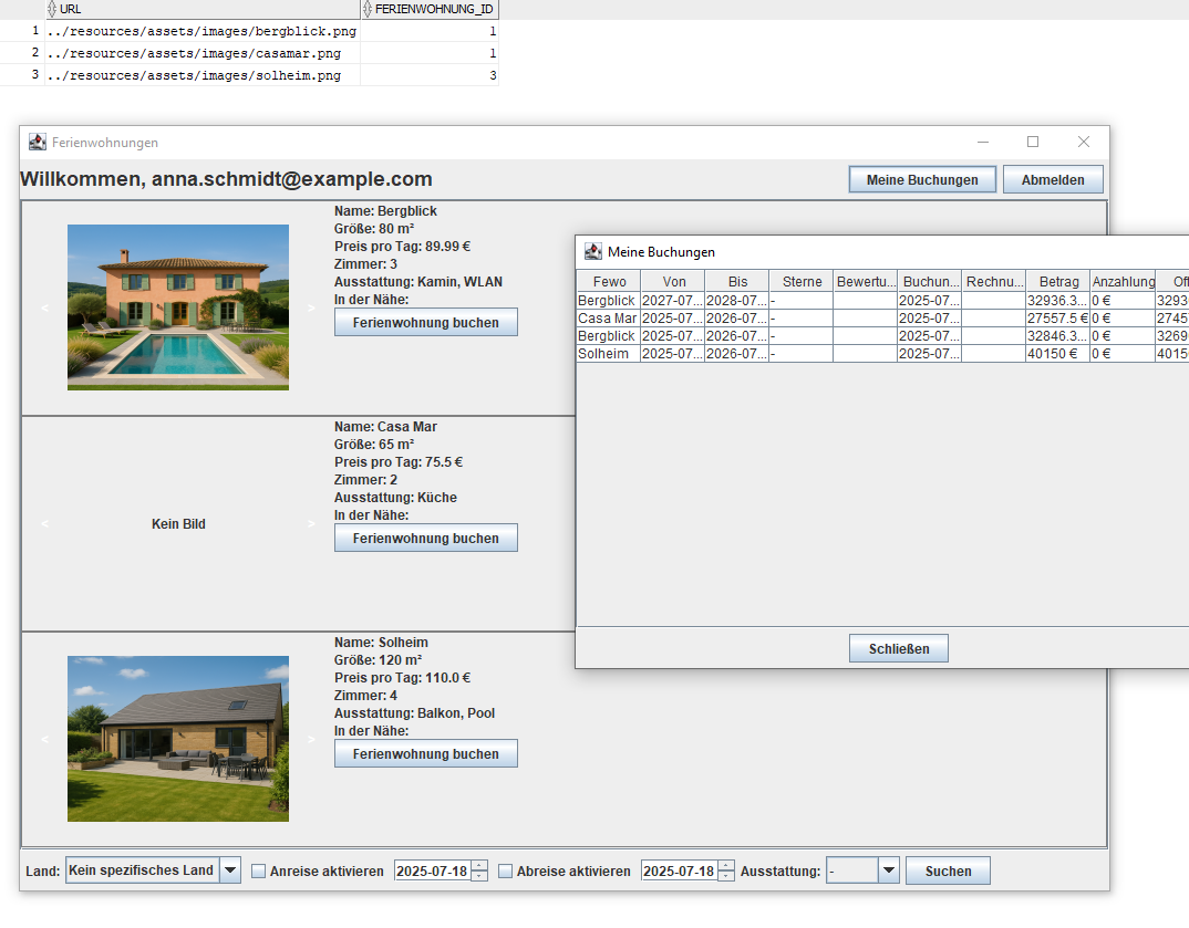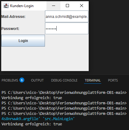 Das stellt eine ganz primitive GUI dar mit der man sich einloggen kann und dann eine Liste aller der Datenbank hinzugefügten Ferienwohnungen bekommt. Ich sage primitiv weil der Login ganz simple gehalten ist.